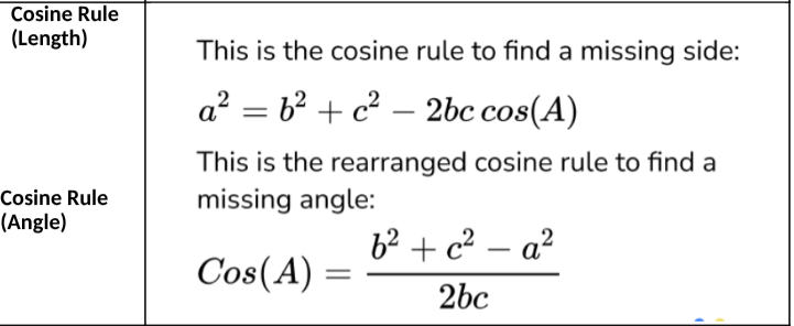 | a² = b² + c² - 2bc × cos A | | | | No | Yes |